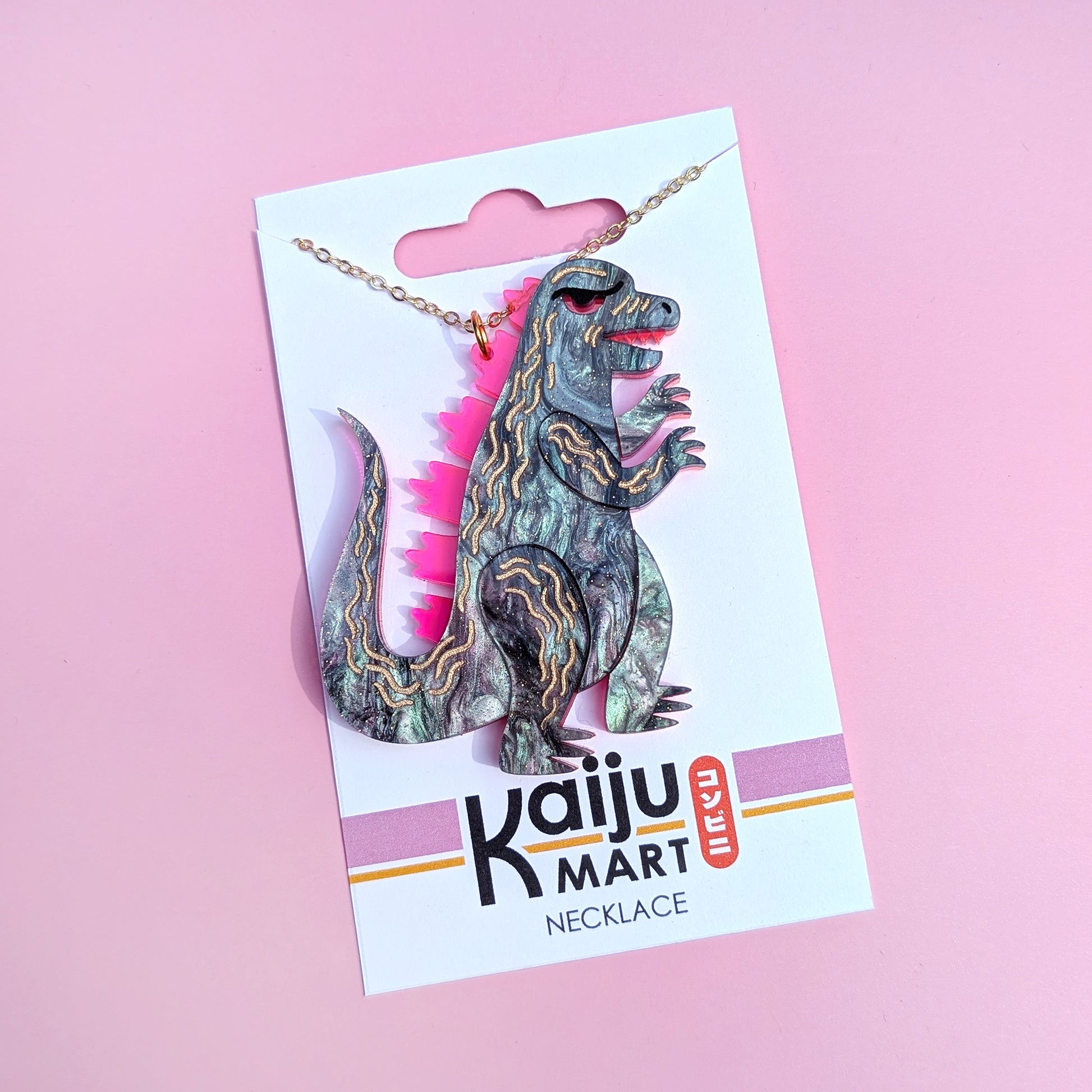 Go Go Godzilla! This Kaiju necklace is sure to turn heads! Featuring a shimmery marbled green and purple acrylic with gold flecks, hand painted details, and your choice of pink or yellow fluorescent detail.